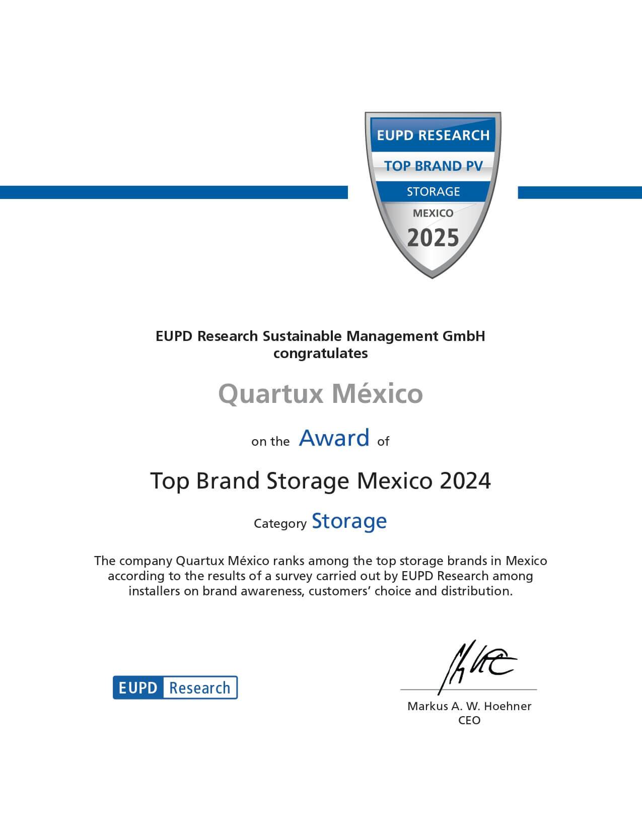 Quartux ha sido galardonado con el prestigioso reconocimiento ‘Top Brand Storage Mexico 2024’ por parte de EUPD Research Sustainable Management GmbH. Este premio destaca a Quartux como la principal marca de almacenamiento de energía en México, consolidando nuestra posición como líder en el sector.